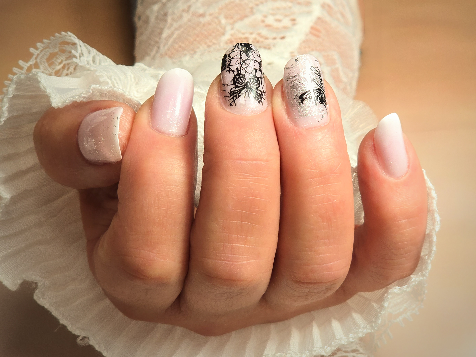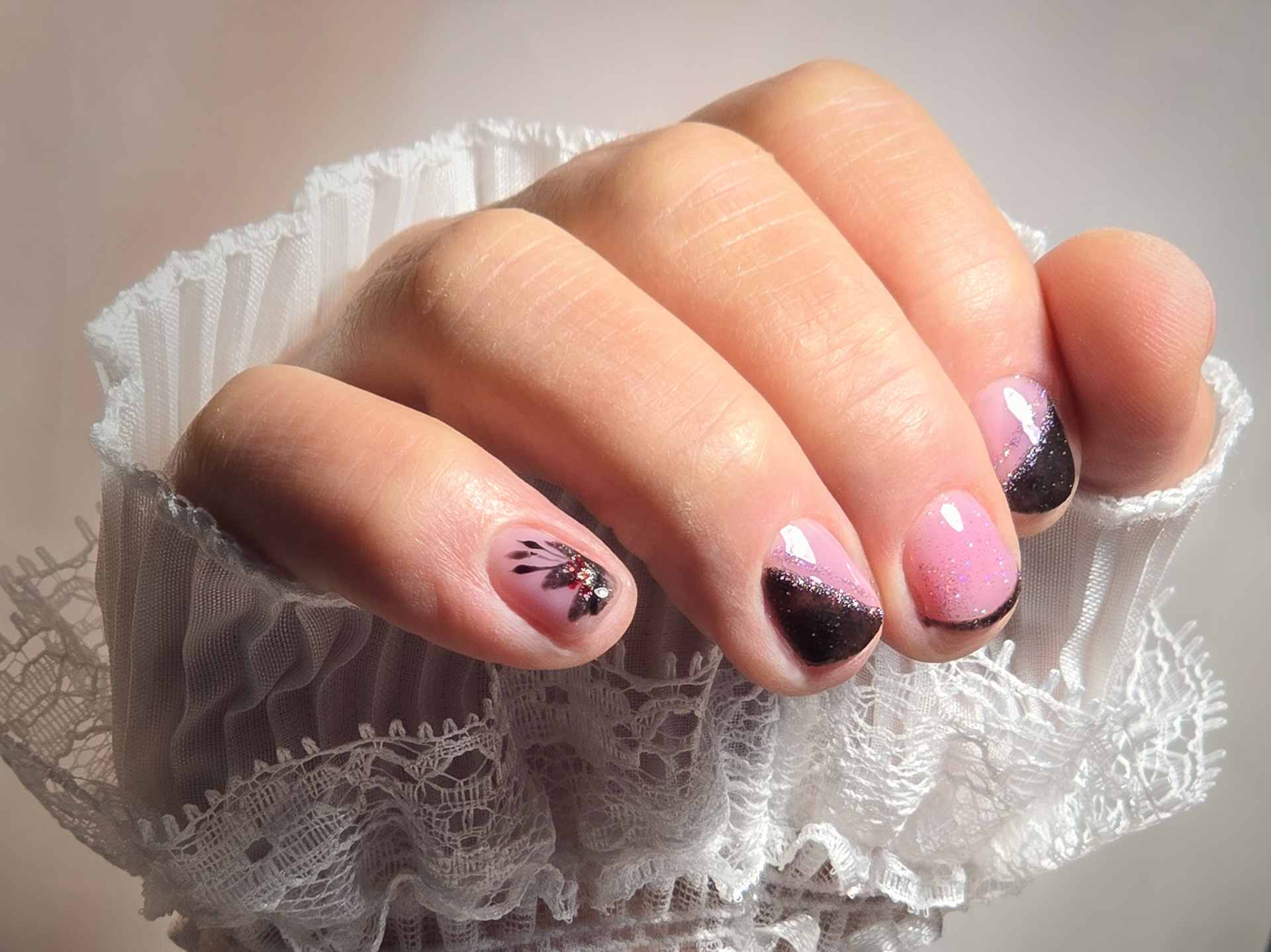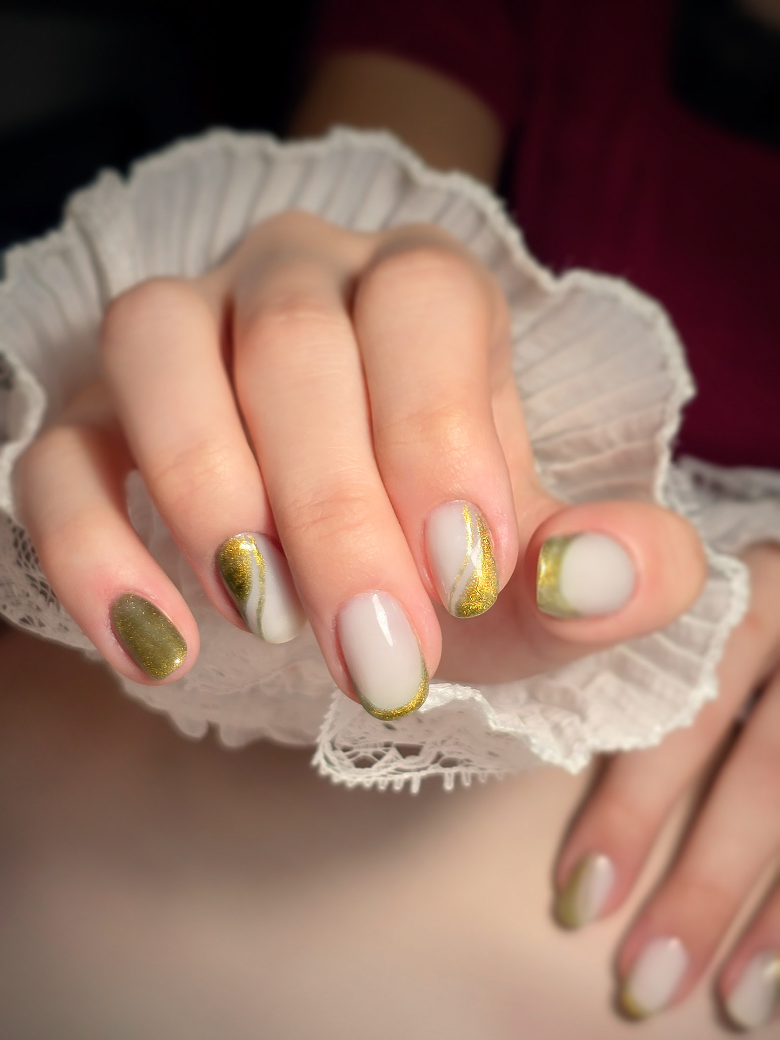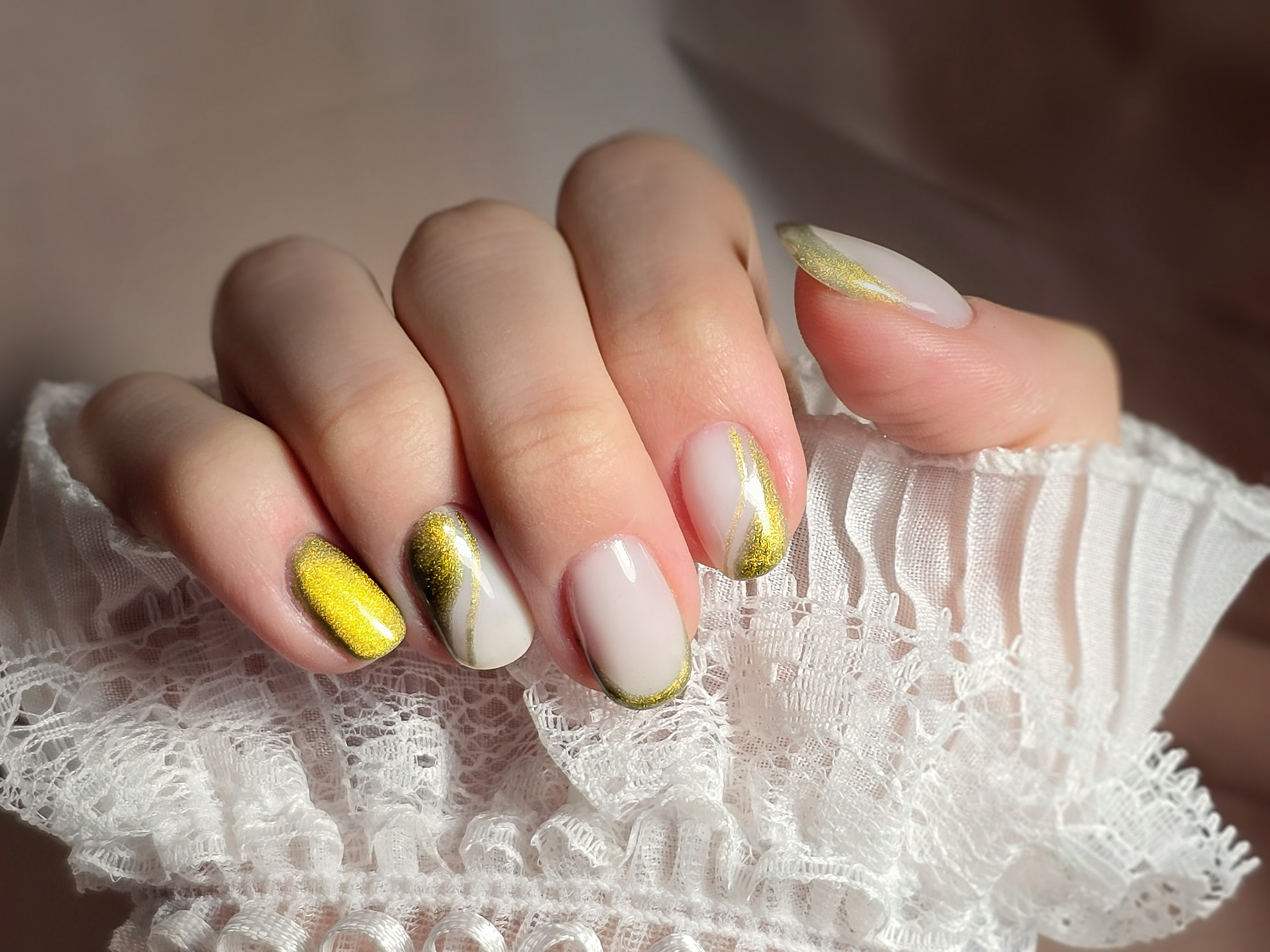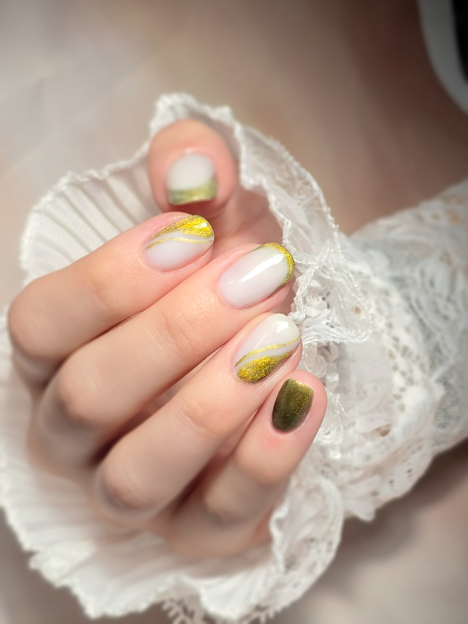 Verča si tentokrát vybrala zlato-zelený magnetický efekt a svůj vlastní styl zdobení – já jen pomohla dotvořit detaily. Všechno je dělané na jejích přírodních nehtech, jen jemně zpevněných a vytvarovaných, aby vydržely co nejdéle a pořád působily přirozeně.