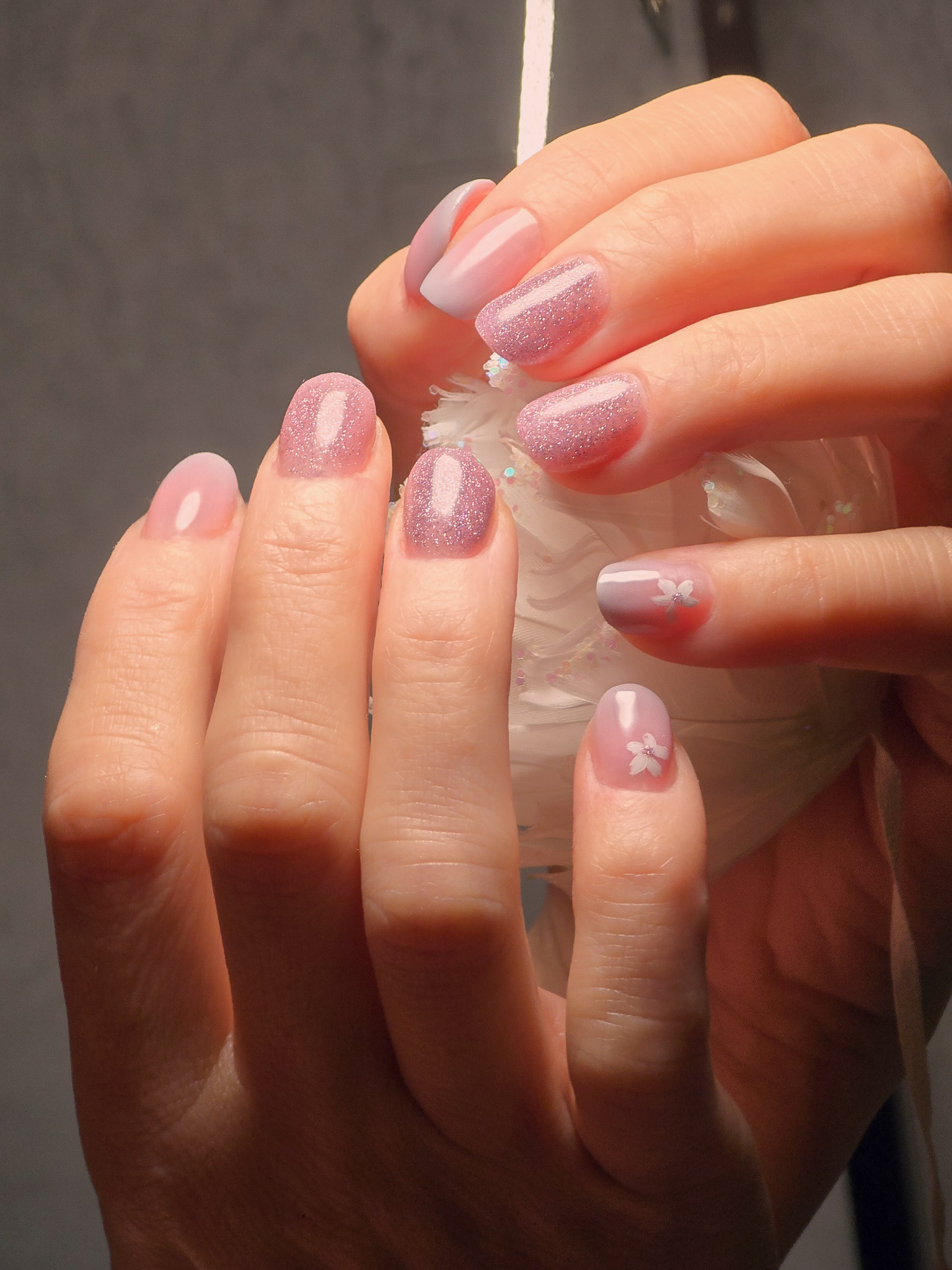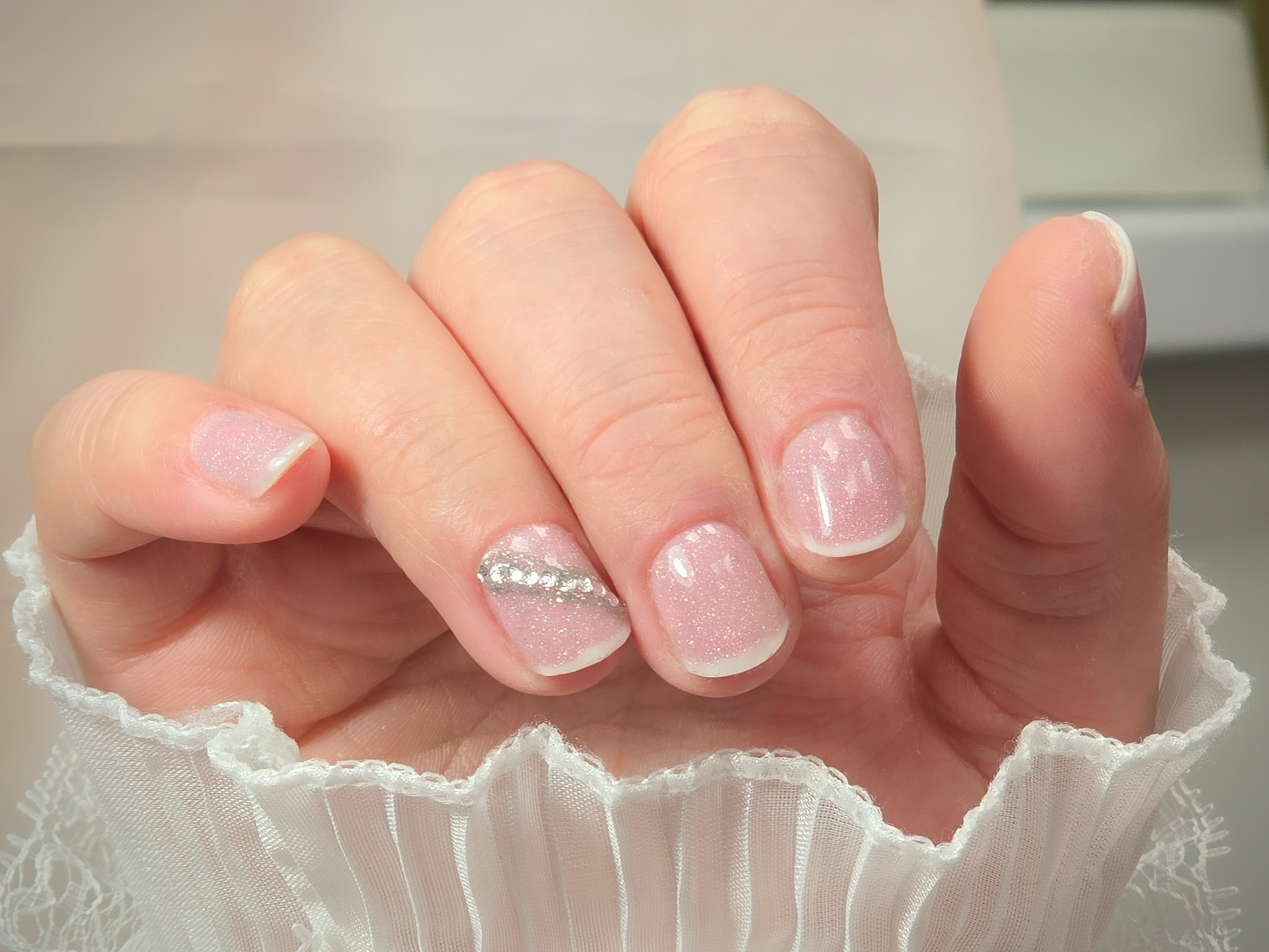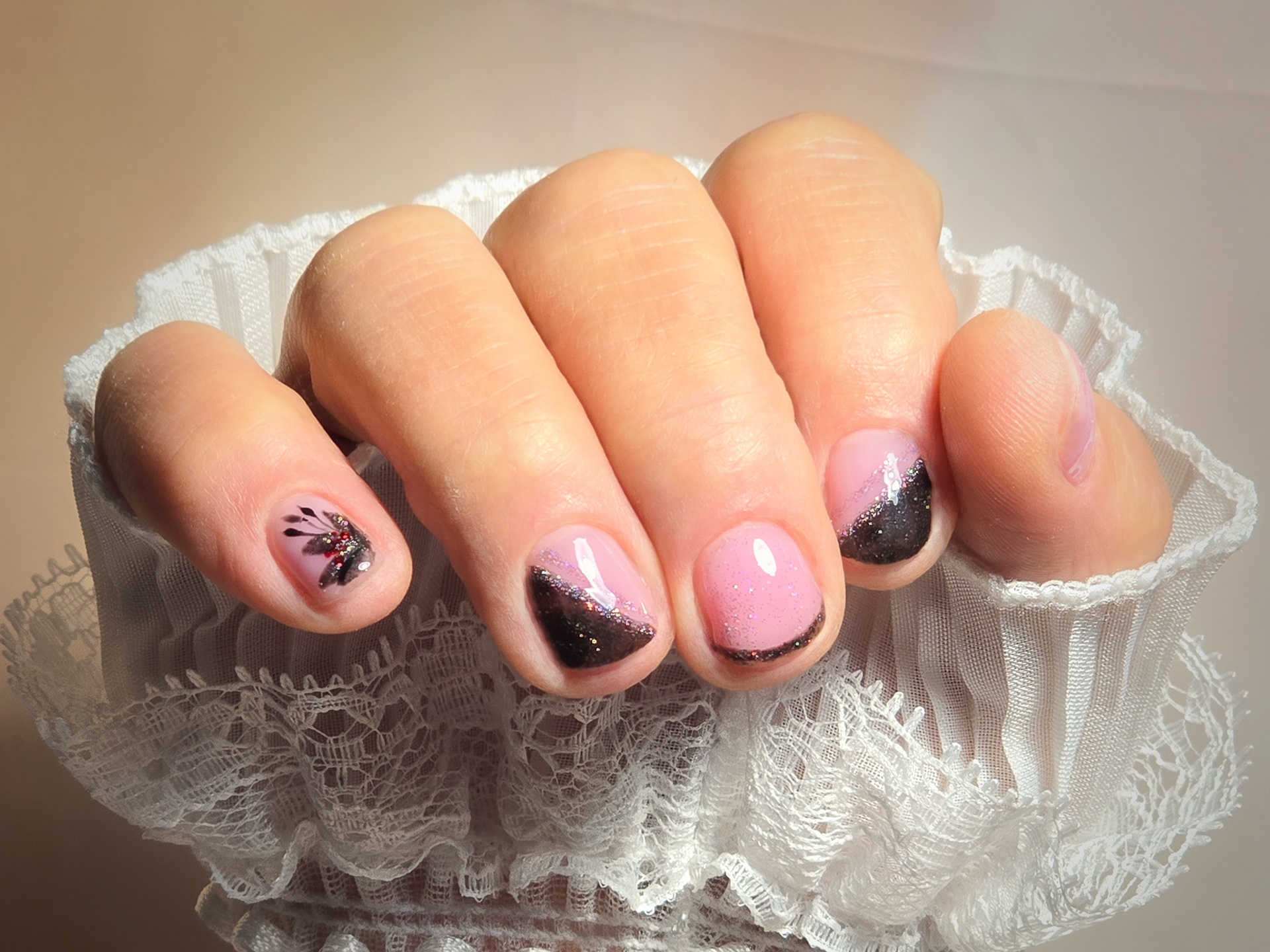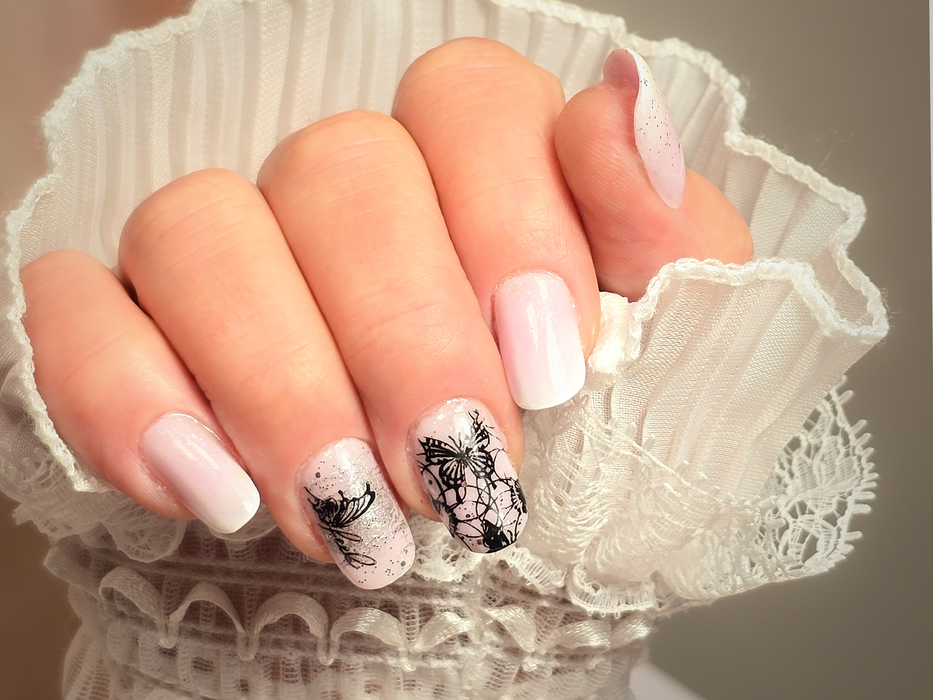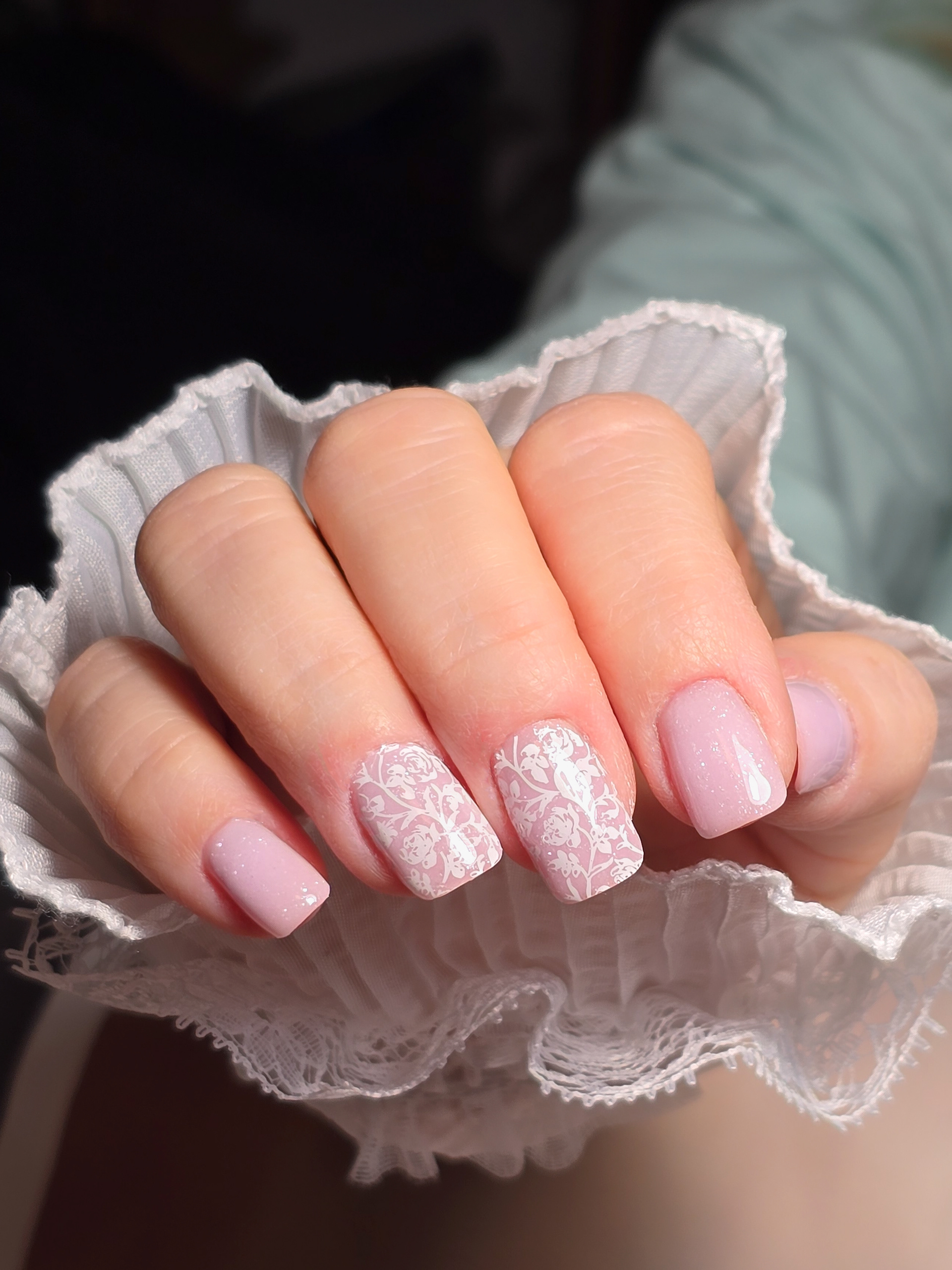 Verča si tentokrát vybrala zlato-zelený magnetický efekt a svůj vlastní styl zdobení – já jen pomohla dotvořit detaily. Všechno je dělané na jejích přírodních nehtech, jen jemně zpevněných a vytvarovaných, aby vydržely co nejdéle a pořád působily přirozeně.