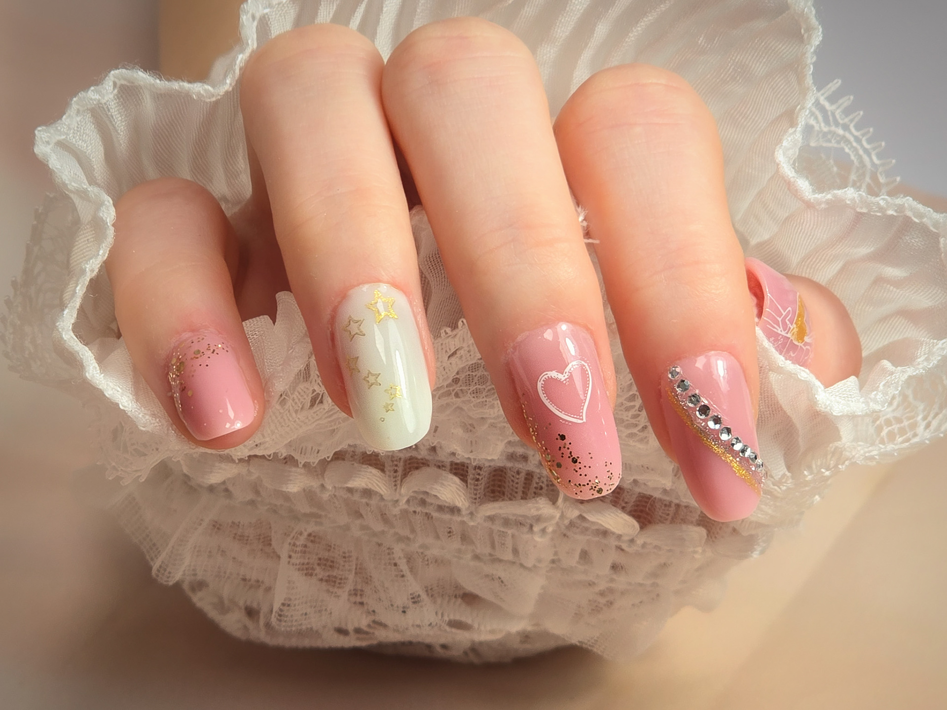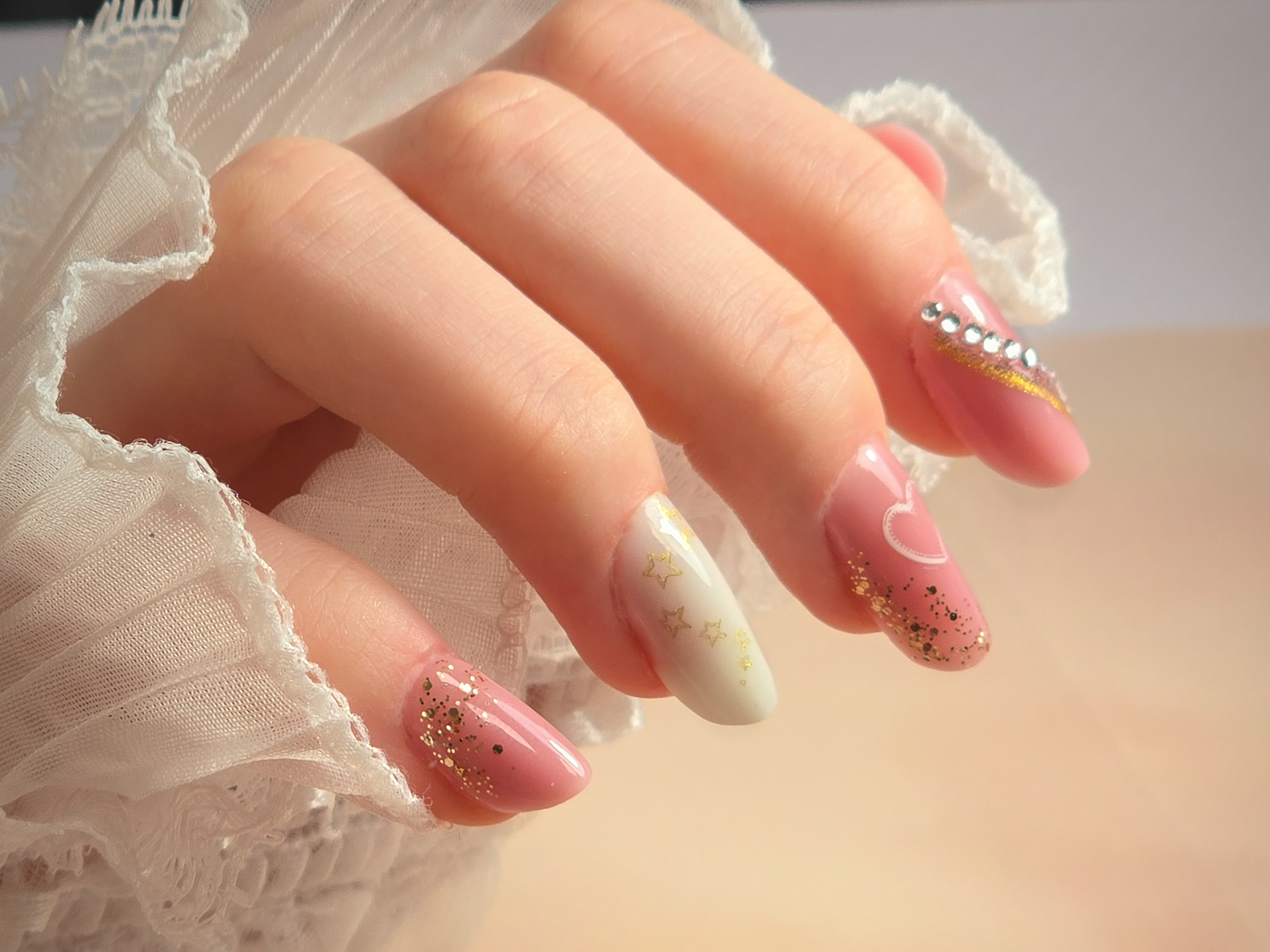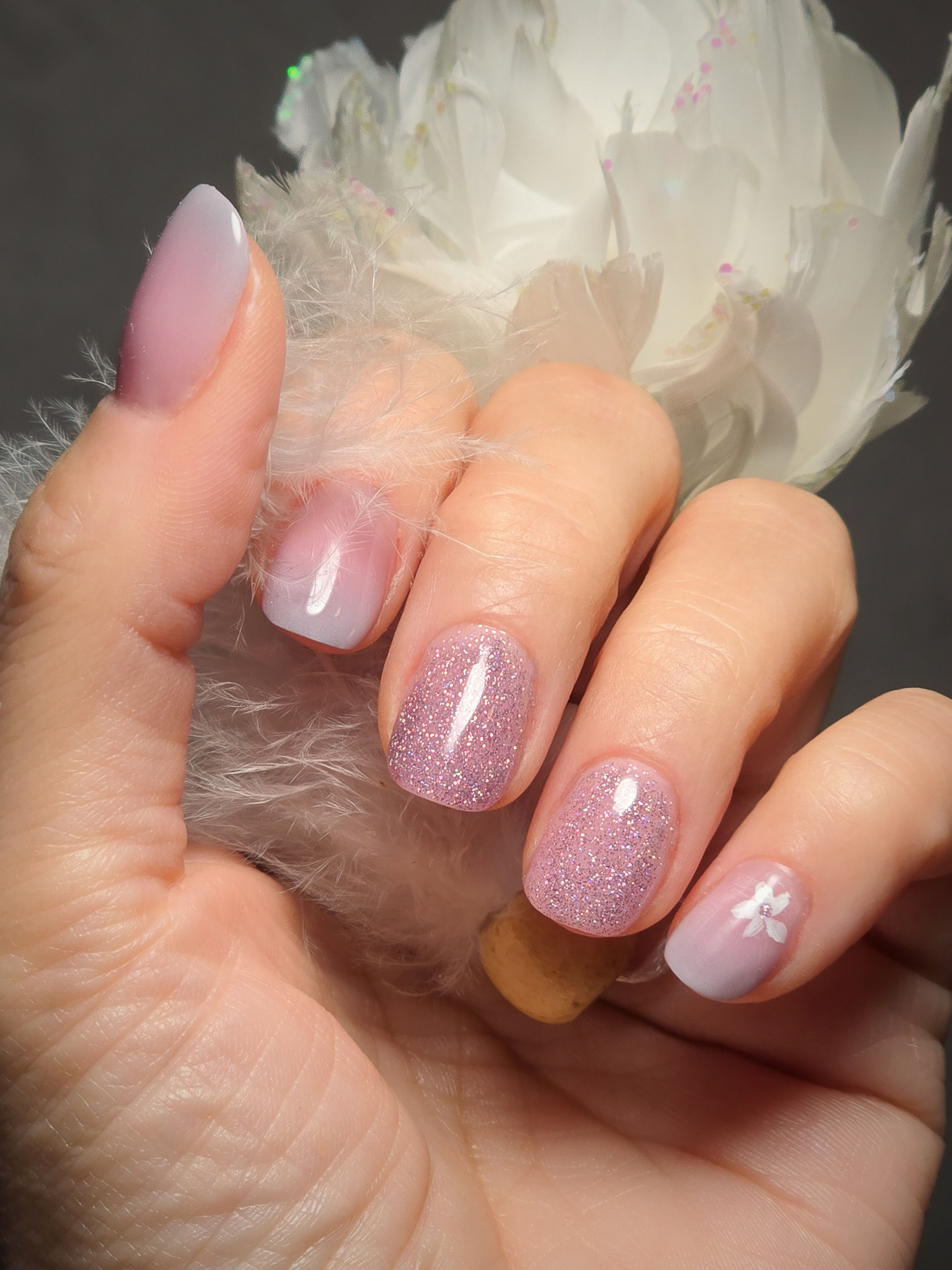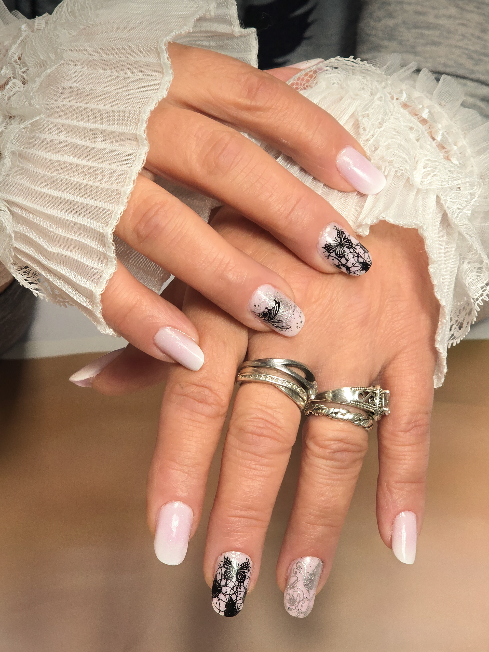 Verča si tentokrát vybrala zlato-zelený magnetický efekt a svůj vlastní styl zdobení – já jen pomohla dotvořit detaily. Všechno je dělané na jejích přírodních nehtech, jen jemně zpevněných a vytvarovaných, aby vydržely co nejdéle a pořád působily přirozeně.