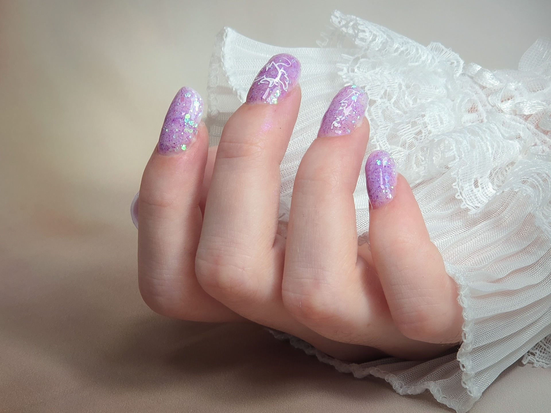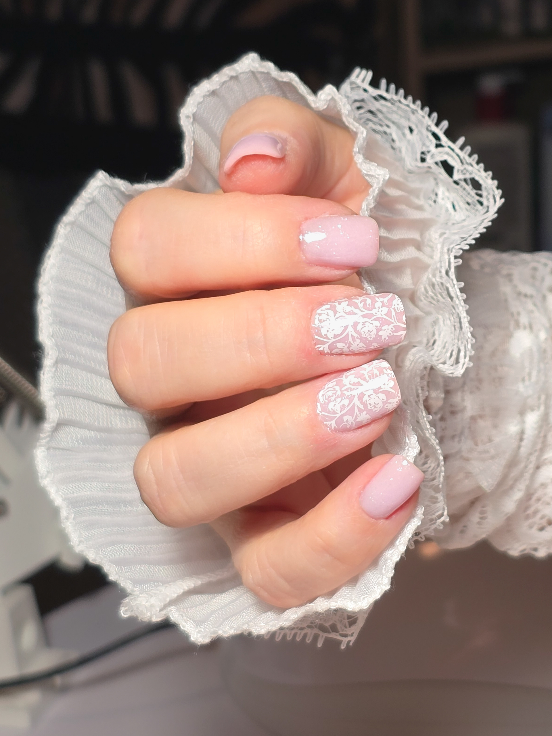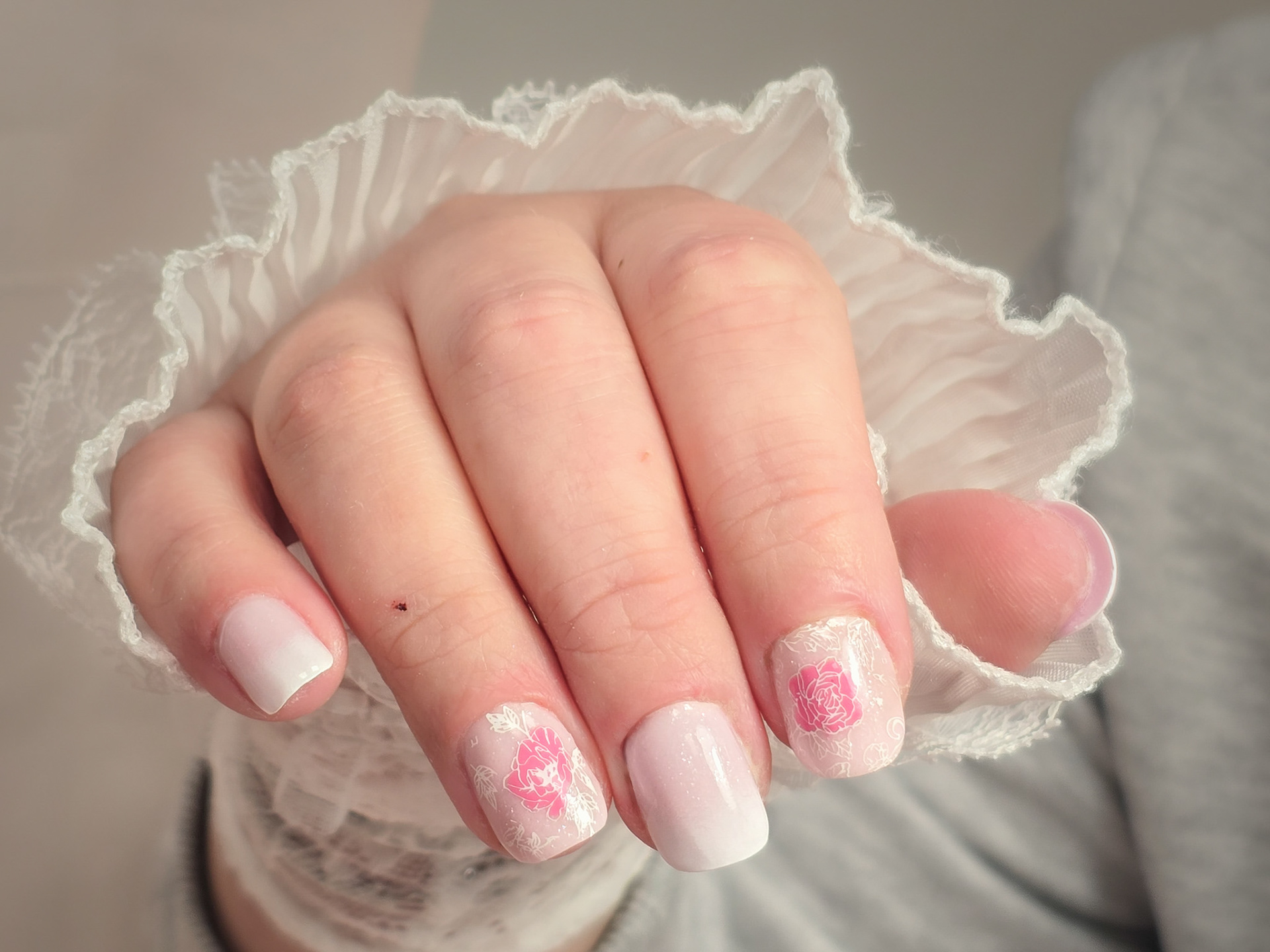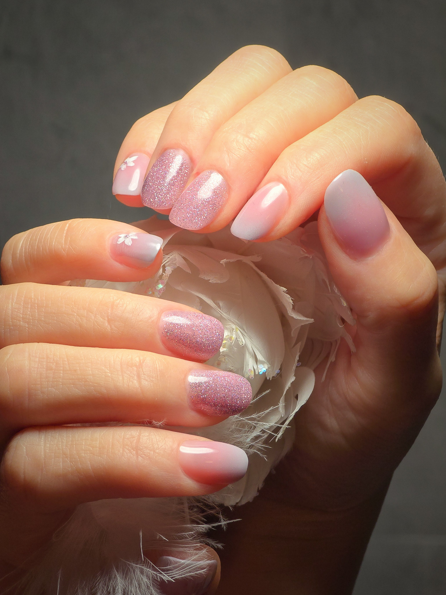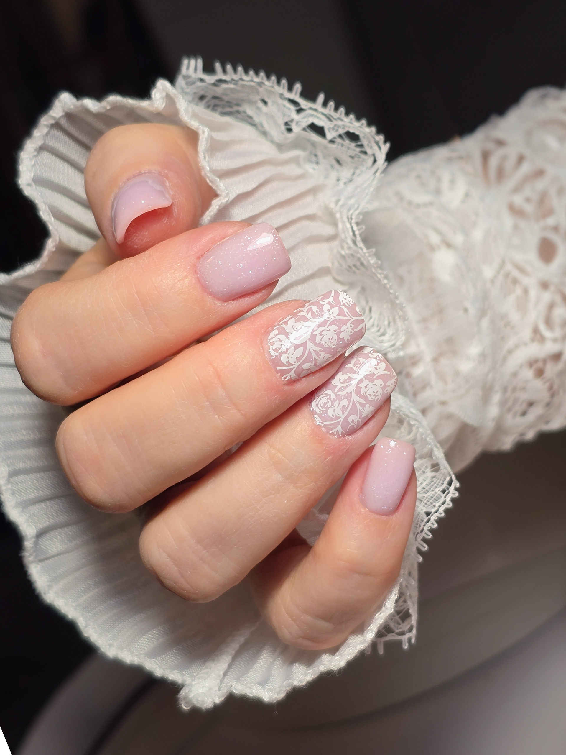 Verča si tentokrát vybrala zlato-zelený magnetický efekt a svůj vlastní styl zdobení – já jen pomohla dotvořit detaily. Všechno je dělané na jejích přírodních nehtech, jen jemně zpevněných a vytvarovaných, aby vydržely co nejdéle a pořád působily přirozeně.