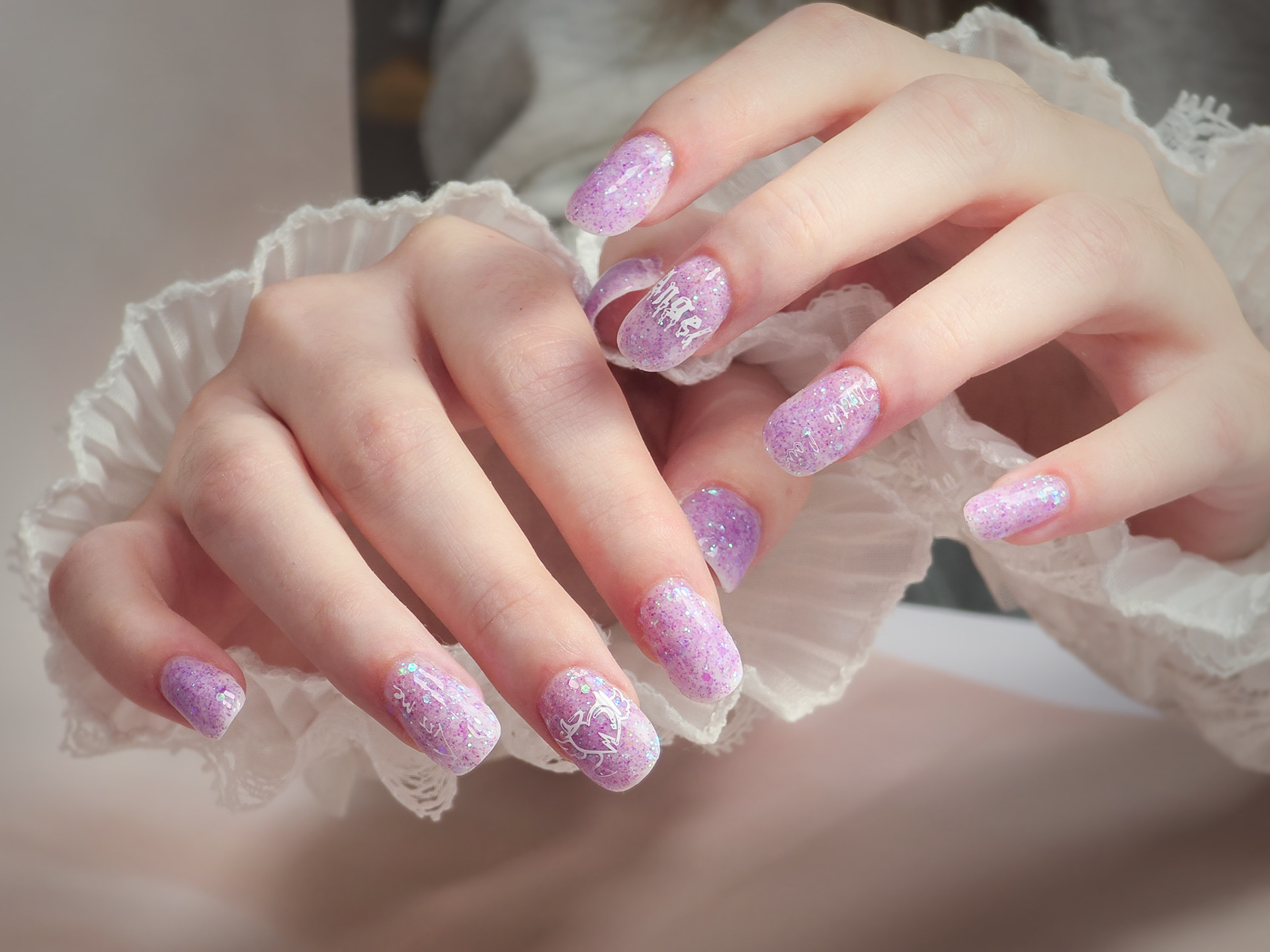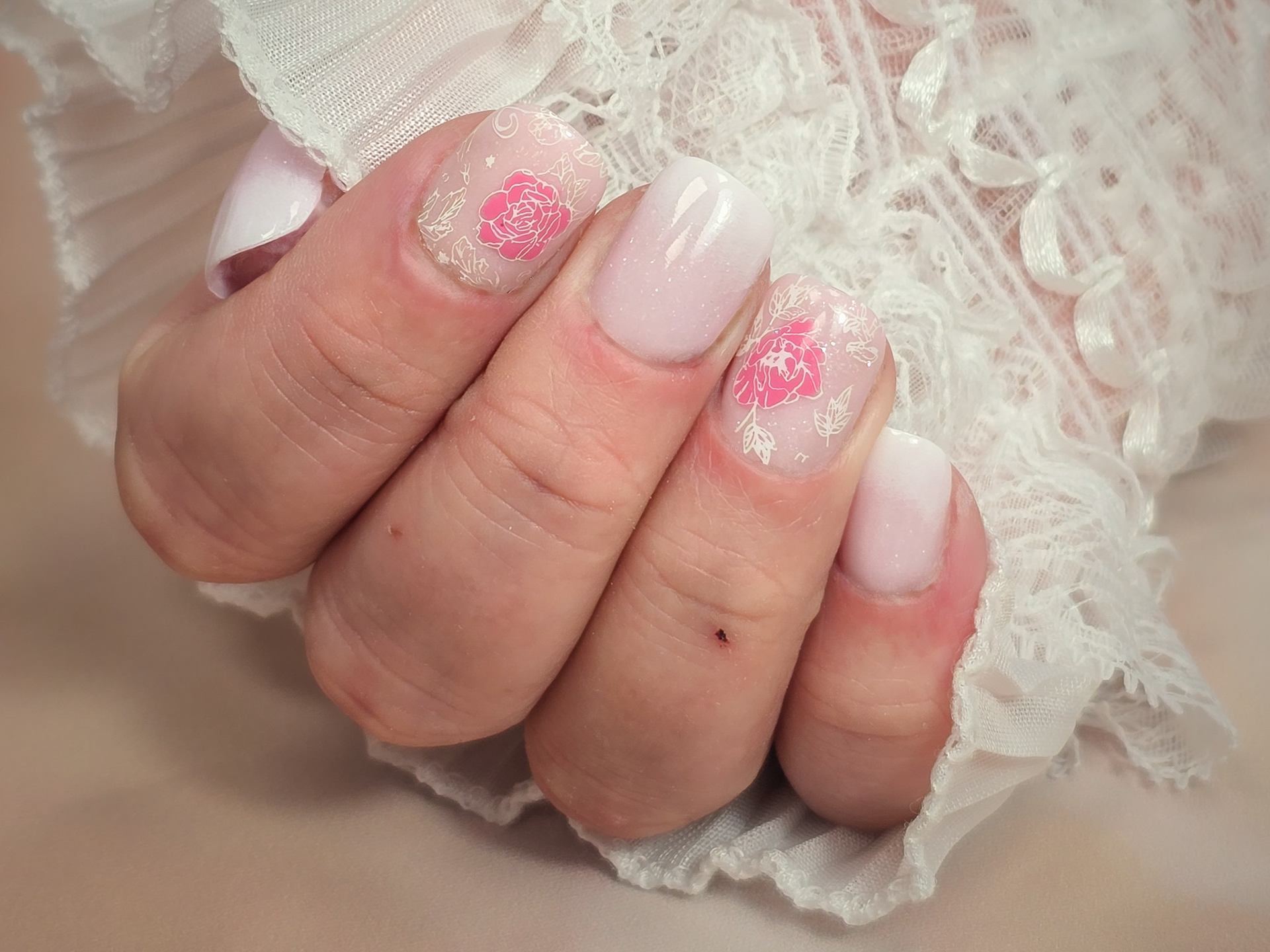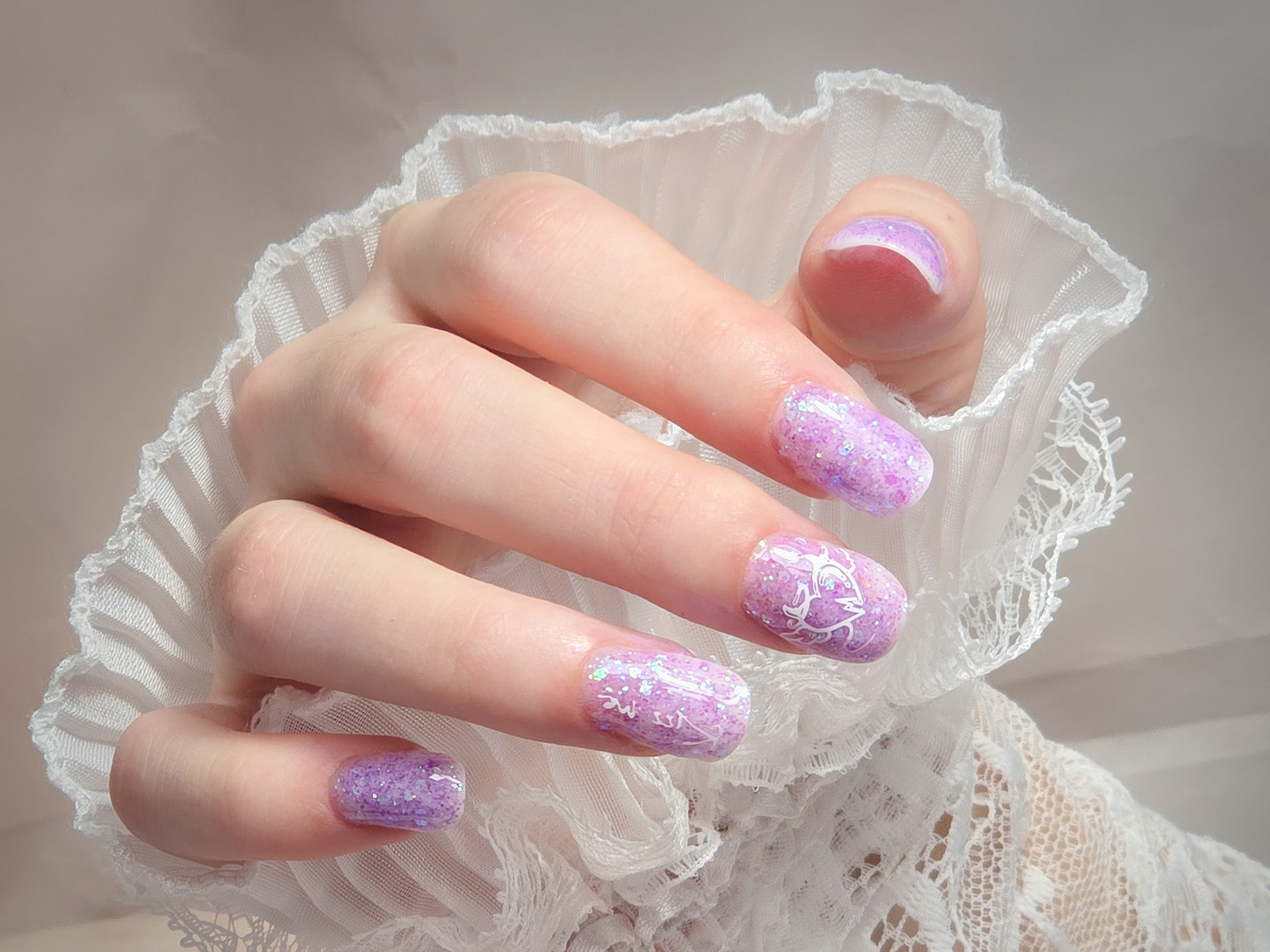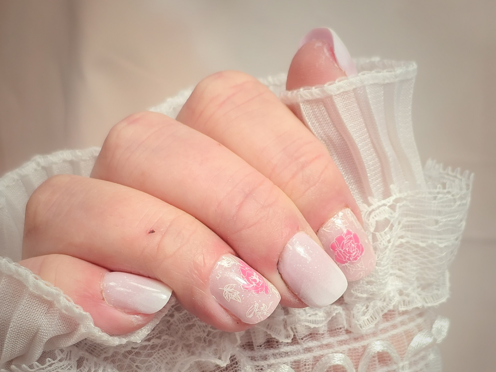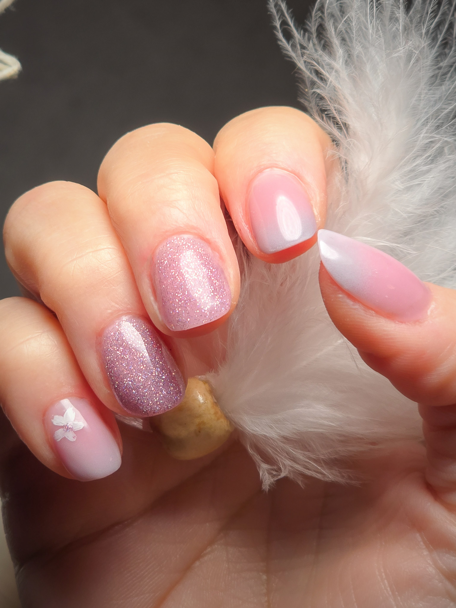 Verča si tentokrát vybrala zlato-zelený magnetický efekt a svůj vlastní styl zdobení – já jen pomohla dotvořit detaily. Všechno je dělané na jejích přírodních nehtech, jen jemně zpevněných a vytvarovaných, aby vydržely co nejdéle a pořád působily přirozeně.